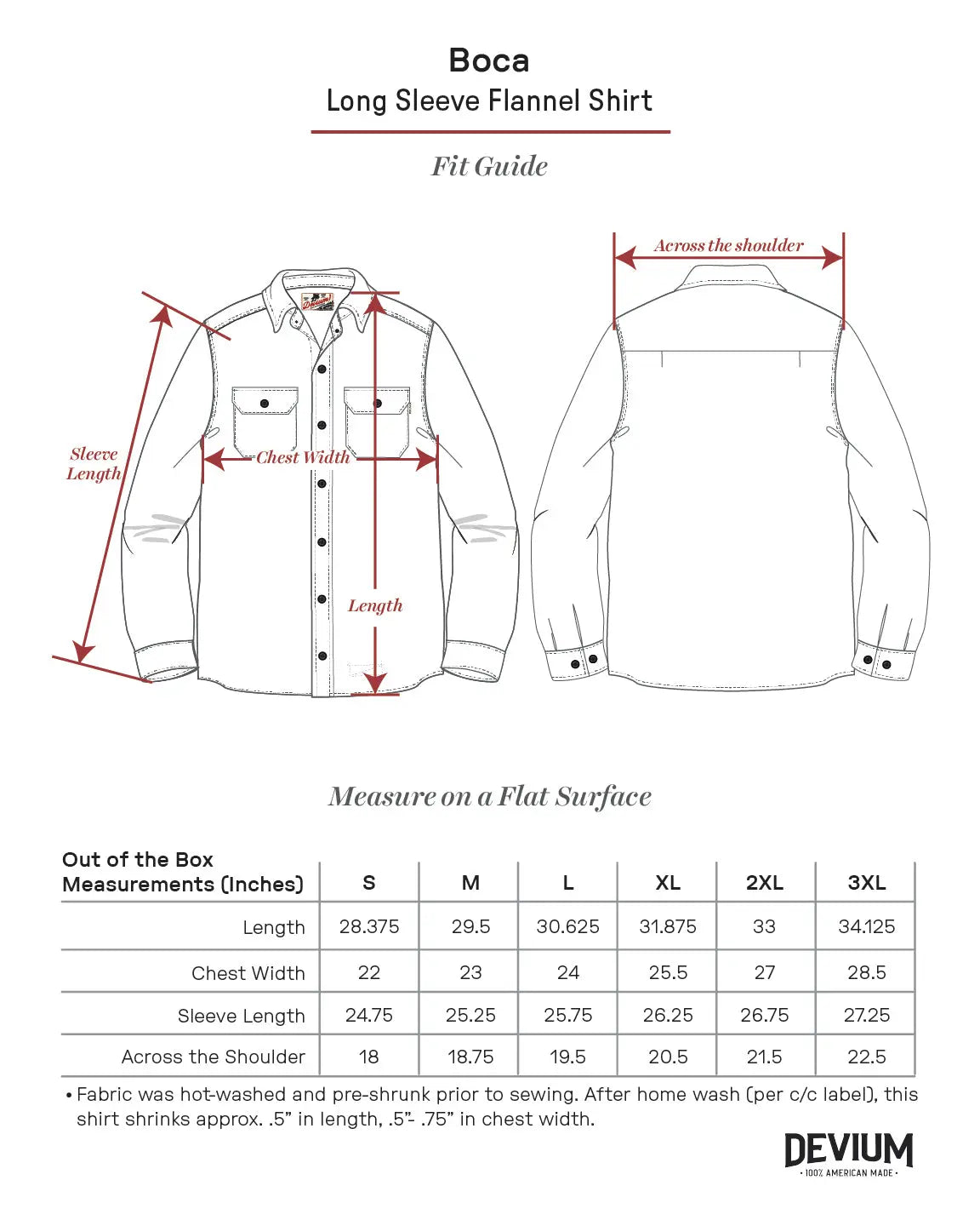 • Fabric was pre-washed and dried before cutting and sewing. Out of the box, expect your shirt to shrink a minimal 1/2 inch in length -- and 1/2 to 3/4 inch in the chest after home wash/dry