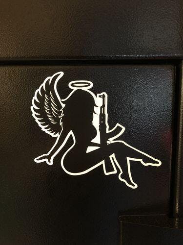 An angel with a halo and wings.....and an AK 47. 💫💫💫 Made locally from American vinyl, our Strapped Mudflap Girl sticker measures 6" wide by 4.25" high. Sold individually.