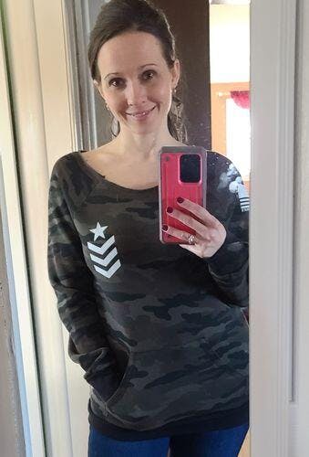 This sexy off-the-shoulder sweater has a raw edge neckline and is printed with a military-style insignia on the left chest and our Old Glory logo on the right sleeve. Super soft. Super cozy. Super cute!