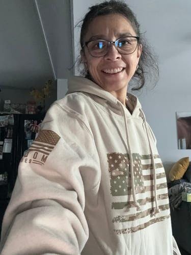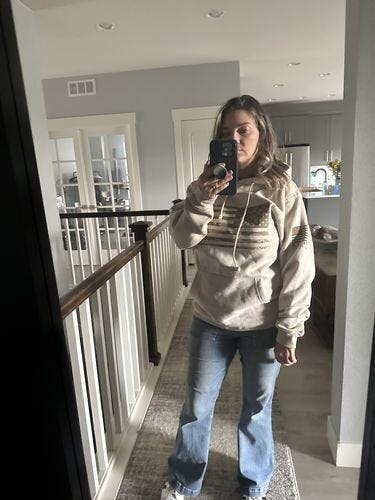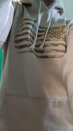 This PREMIUM heavyweight hoodie is a blend of preshrunk cotton and polyester and runs BIG! If you're looking for an oversized, super cozy hoodie, YOU FOUND IT! American made from cotton to printing, this one features an American flag clad in arid camo and our assaulting forward Old Glory logo on the right sleeve.